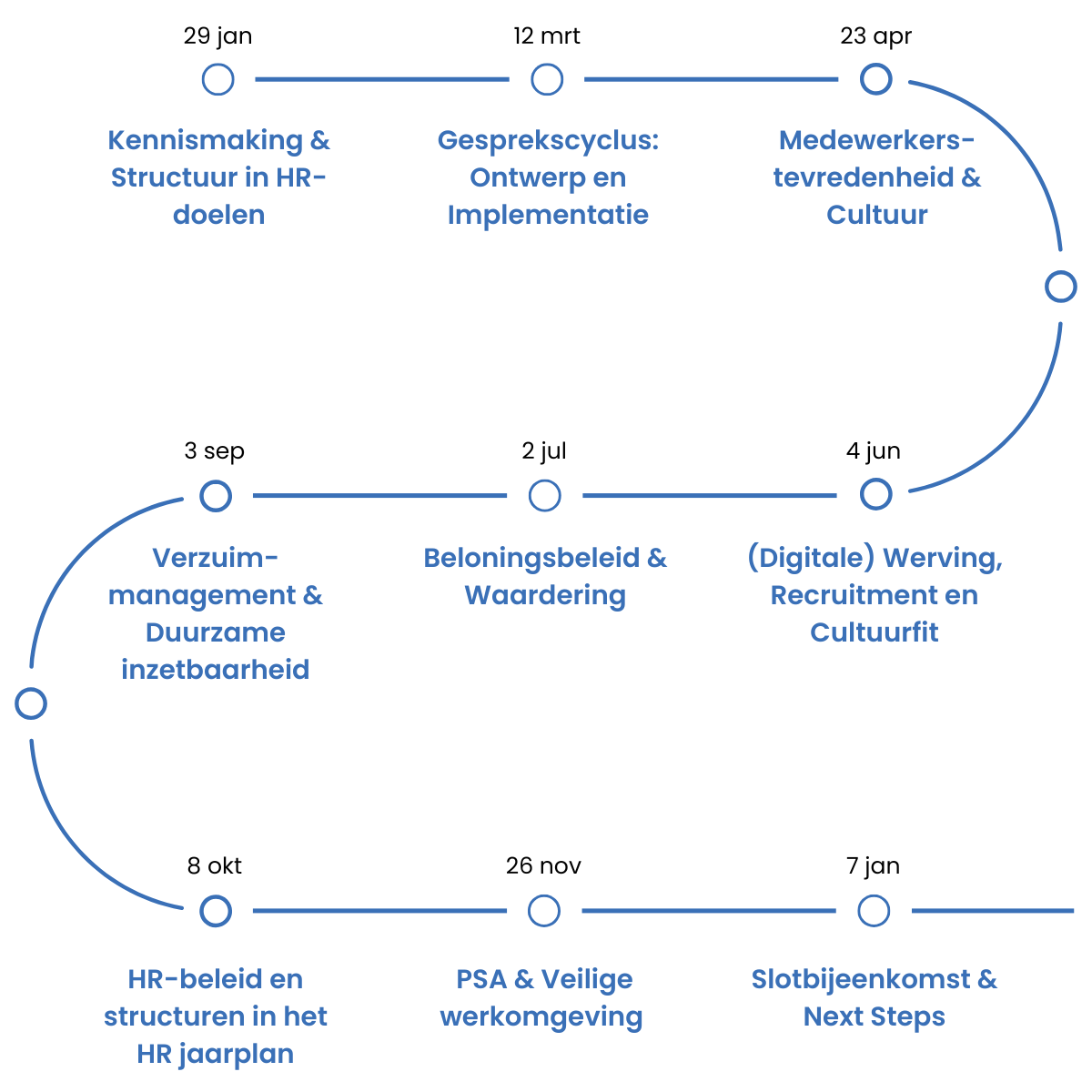 Naast de casussen en vraagstukken die deelnemers inbrengen, werken we binnen de community met thema’s uit ons HR-model die essentieel zijn voor professionele groei. De nadruk ligt op jouw eigen behoefte, ambities en groeipad, met een dynamisch programma waarin je leert, reflecteert en samen groeit.